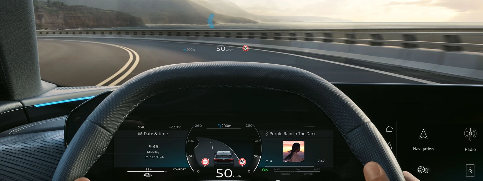 O Audi Virtual Cockpit Plus exibe as informações de condução mais importantes em uma das três variantes de layout, com operação personalizável, navegação de menu intuitiva e display orientado à direção.
